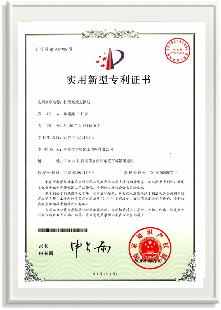 • 柱型高效支撐劑專利證書